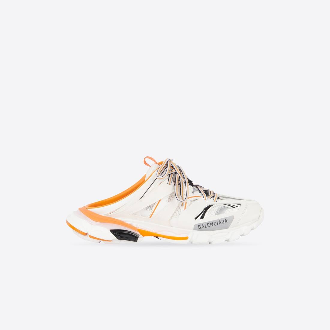 Track Mule in white and orange mesh and nylon PRODUCT DETAILS • 100% non leather sneaker • Mesh and nylon • Mule • Track front and sole with open back • Written size at the edge of the toe • BB embossed on front of the outsole • Balenciaga printed on the exterior • Balenciaga embossed on the tongue • Double laces knotted in a usual equipment way • Tongue pull-on tab • Dynamic sole design with an augmented back to propel feet forward • 1 additional pair of laces included • Made in China • Wipe with a soft cloth Material: 75% polyurethane + 21% polyester + 4% nylon