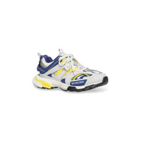 Track Sneaker in white, dark blue, yellow and grey mesh and nylon PRODUCT DETAILS • Leather free • Sneaker • Mesh and nylon • Written size at the edge of the toe • Track embossed at the back of the heel • BB embossed on front of the outsole • Printed logo on the exterior • Embossed logo on the tongue • Double laces knotted in a usual equipment way • Back pull-on tab and tongue pull-on tab • Dynamic sole design with an augmented back to propel feet forward • 1 additional pair of laces included • Made in China • Wipe with a soft cloth Material: 75% polyurethane, 21% polyester, 4% nylon