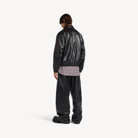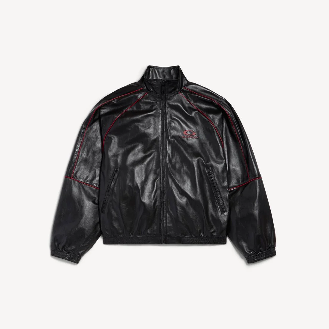 Tracksuit Jacket in black and burgundy semi-shiny lambskin PRODUCT DETAILS • Semi-shiny lambskin • High neck • Front zip fastening • Long raglan sleeves • Red contrasting piping • 2 zipped slash pockets • Loop sports icon artwork debossed and printed on chest • Elasticated cuffs and waistband • Made in Italy Main material: 100% lambskin