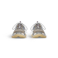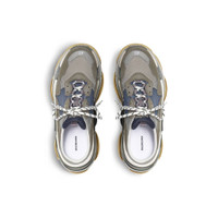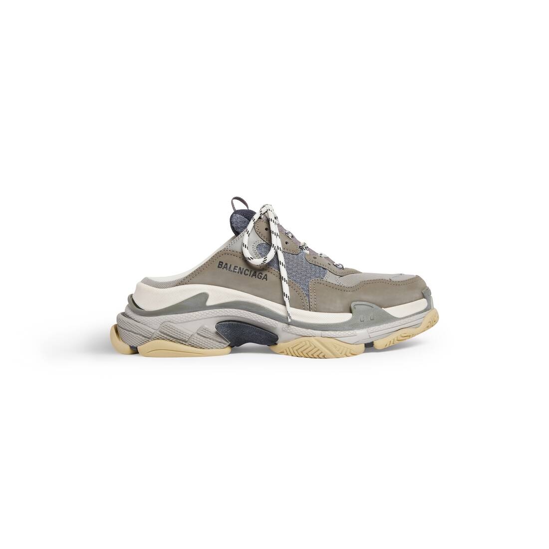 Triple S Mule in grey and blue double foam and mesh PRODUCT DETAILS • Leather free • Mule • Double foam and mesh • Worn-out effect • Triple S front and sole with open back • Complex 3-layered outsole • Embroidered size at the edge of the toe • Embroidered logo on the side • Embossed logo in the back • Triple S rubber branding on the tongue • 2 laces loops including 1 functional • Lacing system featuring 12 fabric eyelets • Bicolor laces recalling hiking boots’ laces • Tongue pull-on tab • Made in China • Wipe with a soft and dry cloth Material: 52% polyester, 48% polyurethane