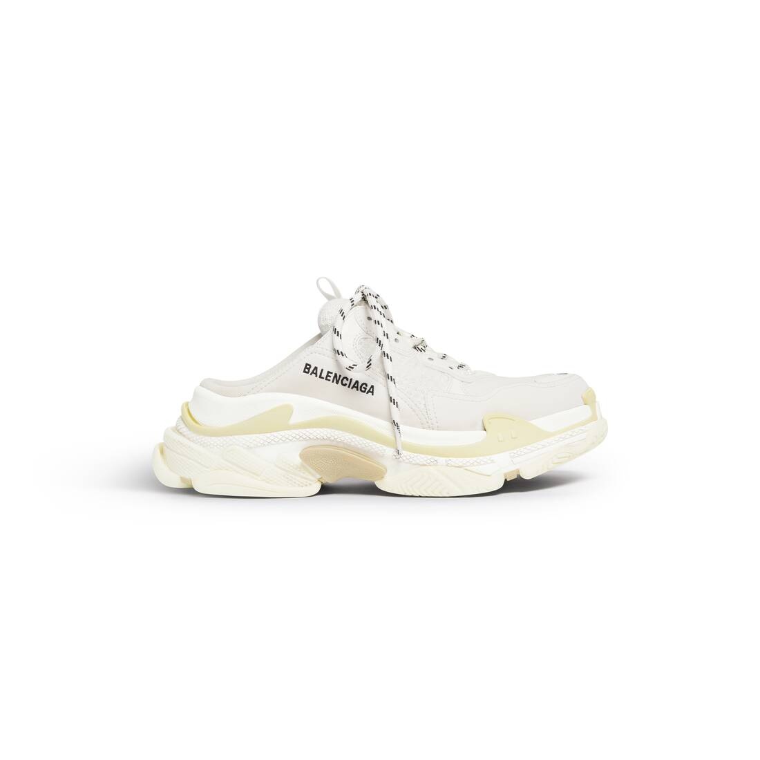 Triple S Mule in white double foam and mesh PRODUCT DETAILS • Leather free • Mule • Double foam and mesh • Triple S front and sole with open back • Complex 3-layered outsole • Embroidered size at the edge of the toe • Embroidered logo on the side • Embossed logo in the back • Triple S rubber branding on the tongue • 2 laces loops including 1 functional • Lacing system featuring 12 fabric eyelets • Bicolor laces recalling hiking boots’ laces • 1 additional pair of laces • Tongue pull-on tab • Made in China • Wipe with a soft and dry cloth Material: 52% polyester, 48% polyurethane