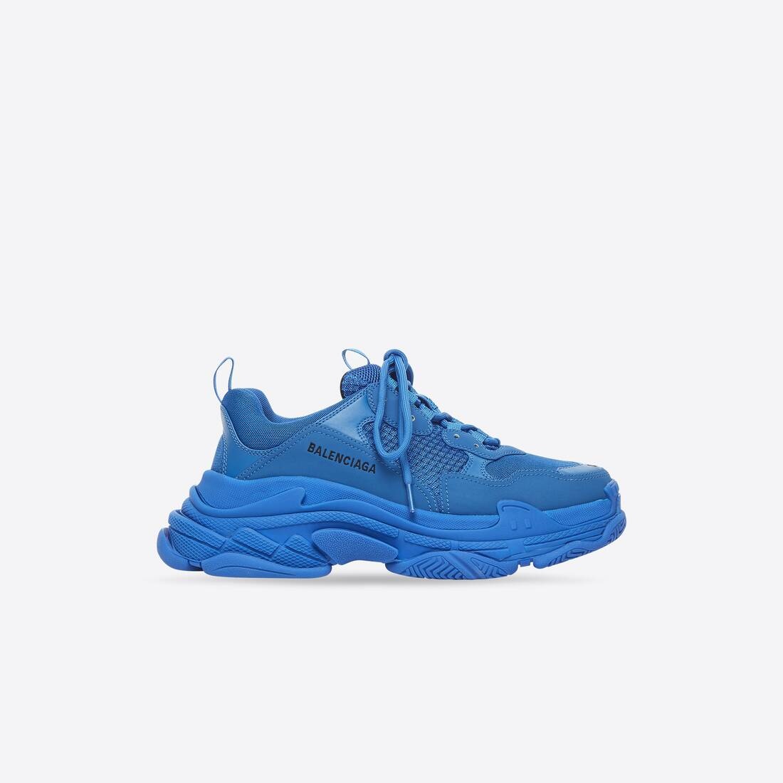 Triple S Sneaker in blue double foam and mesh PRODUCT DETAILS • 100% leather free Sneaker • Double foam and mesh Sneaker • Complex 3-layered outsole • Embroidered size at the edge of the toe • Embroidered logo on the side • Embossed logo in the back • Triple S rubber branding on the tongue • 2 laces loops including 1 functional • Athletic lacing system featuring 12 fabric eyelets • Monocolor laces recalling hiking boots’ laces • 1 additional pair of laces • Back pull-on tab and tongue pull-on tab • Made in China • Wipe with a soft cloth Material: 48% polyurethane + 52% polyester