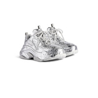 Triple S Sneaker in silver metallic Arena lambskin PRODUCT DETAILS • Sneaker • Metallic Arena lambskin • Complex 3-layered outsole • Embroidered size at the edge of the toe • Embroidered logo on the side • Debossed logo in the back • Triple S rubber branding on the tongue • 2 laces loops including 1 functional • Lacing system featuring 12 fabric eyelets • Laces recalling hiking boots’ laces • Back and tongue pull-on tab • Made in China Material: lambskin