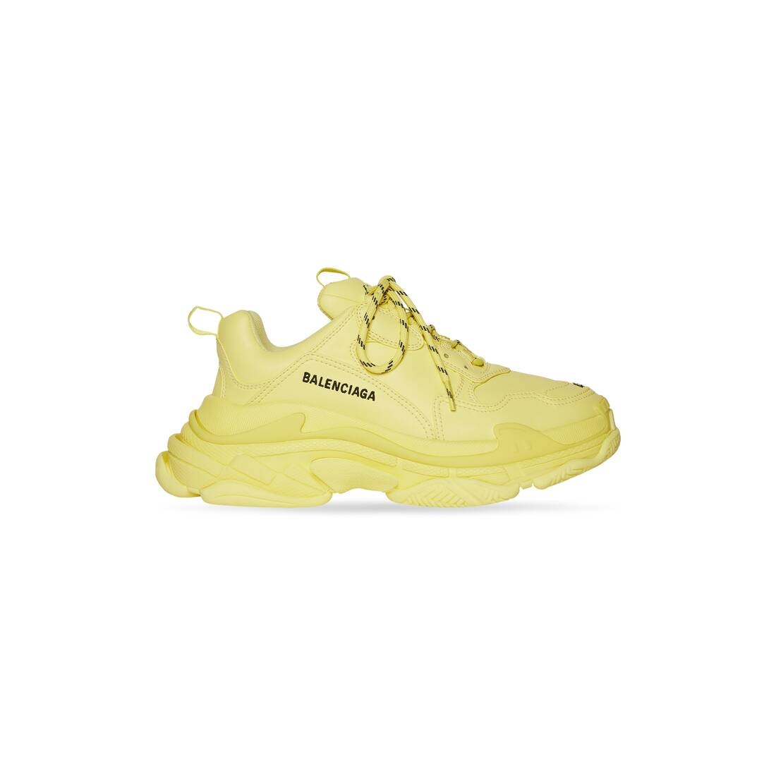 Triple S Sneaker in light yellow technical material PRODUCT DETAILS • Sneaker • Fake leather • Complex 3-layered outsole • Embroidered size at the edge of the toe • Embroidered logo on the side • Embossed logo in the back • Triple S rubber branding on the tongue • 2 laces loops including 1 functional • Athletic lacing system featuring 12 fabric eyelets • Bicolor laces recalling hiking boots’ laces • 1 additional pair of laces • Back pull-on tab and tongue pull-on tab • Made in China • Wipe with a soft and dry cloth Material: 95% polyurethane, 5% polyester