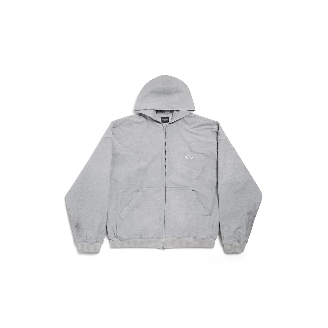 Trompe L'Œil Hoodie in heather grey cotton denim is from look 38 of Balenciaga Fall 25 Collection. PRODUCT DETAILS • Cotton denim • Hood without drawstring • Zipped front • Dropped shoulders • 2 pockets at front • Gathered at cuffs and waistline • Ribbed trims • Loop Sports Icon embroidered at chest • Made in Japan Main material: 100% cotton