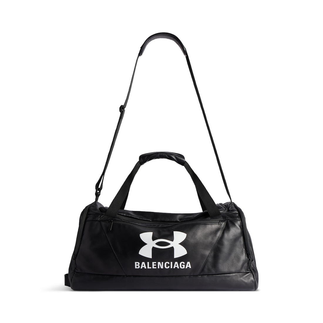 Under Armour® Gym Bag in black smooth lambskin PRODUCT DETAILS • Dimensions: L21,2 x H10,2 x W10,2 inch • Smooth lambskin • Gym bag • Two handles • Adjustable strap with shoulder pad (drop: 21,6 inch) • Crossbody and hand carry • Under Armour® artwork printed at front • In collaboration with Under Armour® • Matte black hardware • Front zipped pocket • Back zipped pocket • Two zipped pockets on the side • Double ended zipped closure • 1 main compartment • Balenciaga logo engraved zipper puller • Nylon lining • Made in Italy Material: lambskin, polyamide, cotton, viscose