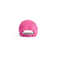 Upcycled Cap in pink cotton drill PRODUCT DETAILS • Cotton drill • Classic baseball cap shape • Ventilation eyelets embroidered on top • Adjustable hook and loop tab at back • Upcycled detailing at front • Worn-out and dirty effect • Balenciaga logo embroidered at front • Rhinestones and scribbles allover • Made in Italy • Due to Upcycling process, all the pieces are unique Main material: 100% cotton
