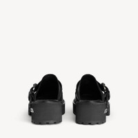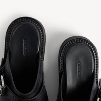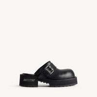 Venom Mule in black worn-out calfskin PRODUCT DETAILS • Calfskin • Mule • Extra round toe • 20mm arch • Worn-out effect • Adjustable strap with belt buckle • Plate with Balenciaga logo engraved on exterior outsole • Thick toothed rubber outsole • Made in Italy Upper: calfskin - Sole: micro, TPU, calfskin, zamak - Insole: calfskin