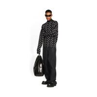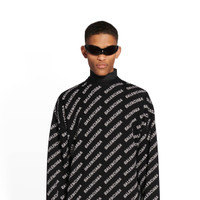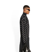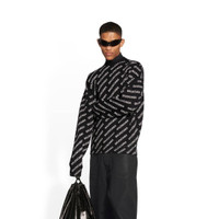 Mini Allover Logo Sweater in black and white wool knit PRODUCT DETAILS • Mini Allover Logo wool knit • Large fit • Crewneck • Long sleeves • Dropped shoulders • Ribbed finishing at collar, cuffs and bottom • Placed diagonal Balenciaga logo from sleeves to front • Made in Italy • Dry cleaning • Model is 188 cm / 6'1'' and is wearing a size S Material: 75% wool, 25% polyamide