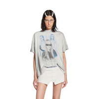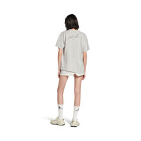 Nicole Boxy T-Shirt in dirty white dry jersey PRODUCT DETAILS • Dry jersey • Crinkled effect • Crewneck • Short sleeves • Nicole artwork printed at front and autograph printed at back • Balenciaga logo embroidered on left sleeve • Asymmetrical bottom • Made in Portugal Main material: 100% cotton
