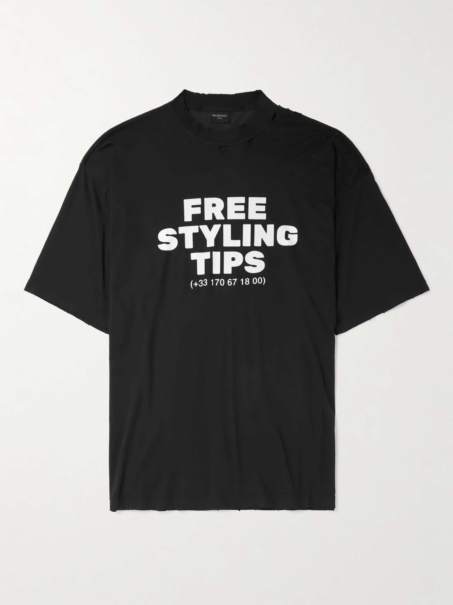 Offering free styling tips and a hotline, Balenciaga's T-shirt is cut from soft cotton-jersey in an oversized fit and lightly distressed to look like a style you've had for a while. It'll team well with similarly baggy denim or sweats, but you don't need our advice. Size & Fit - Model wears a size larger to achieve a looser fit - Mid-weight, slightly stretchy fabric - Model is shown wearing a M - Model measures: chest 36"/ 92cm, height 6'2"/ 188cm Details & Care - Black and white cotton-jersey - 100% cotton