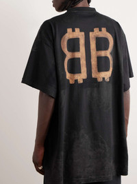 Balenciaga constantly refreshes its logo in creative ways – this T-shirt reimagines it as a cryptocurrency. Made from cotton-jersey, it's cut for an oversized fit, then bleached and distressed for a lived-in feel. Size & Fit - Size 1 = 5’7”(170cm), 2 = 5’9”(175cm), 3 = 5’11”(180cm) and 4 = 6’1”(185cm) - Fits true to size. Take your normal size - Designed for an oversized fit - Dropped shoulder seam - Mid-weight, slightly stretchy fabric - Model is shown wearing a 4 - Model measures: chest 36"/ 92cm, height 6'2"/ 188cm Details & Care - Black and orange cotton-jersey - 100% cotton; trim: 97% cotton, 3% elastane - Machine wash