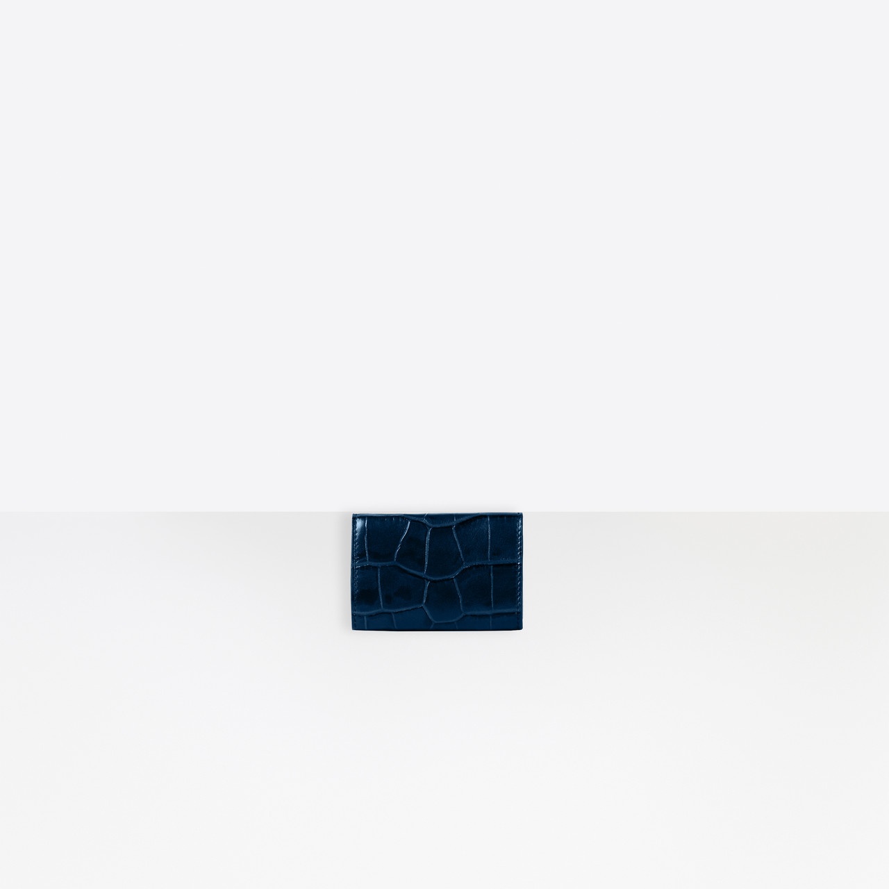 Papier Mini Wallet in dark blue crocodile embossed calfskin PRODUCT DETAILS Dimensions: W 3.9 inches H 2.7 inches D 1.2 inches Composition: 100% Lambskin - Crocodile embossed calfskin - Envelope design - Mini flap wallet function - Snapped flap closure - Balenciaga embossing on front - 1 snapped bill pocket - 3 card slots - 1 snapped coin purse - Made in Italy - Wipe with a soft and clean cloth - The item comes with a Balenciaga dustbag and box