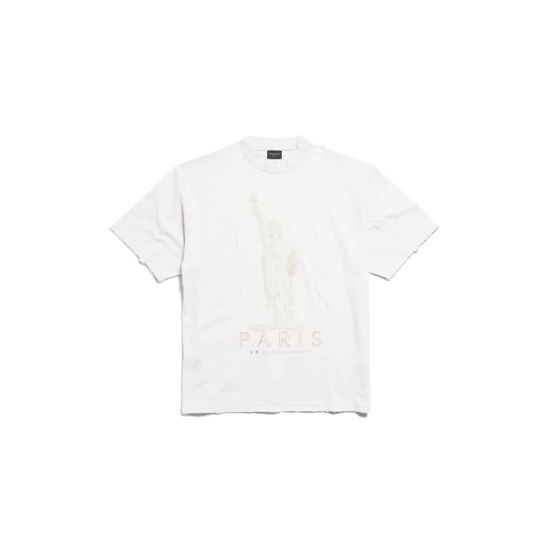 Paris Liberty T-Shirt Medium Fit in off white vintage jersey PRODUCT DETAILS • Vintage jersey • This item is unisex • Crewneck • Short sleeves • Paris liberty artwork printed at front • Faded effect artwork • Balenciaga logo embroidered at back • Destroyed effect • Made in Portugal Material: 100% cotton