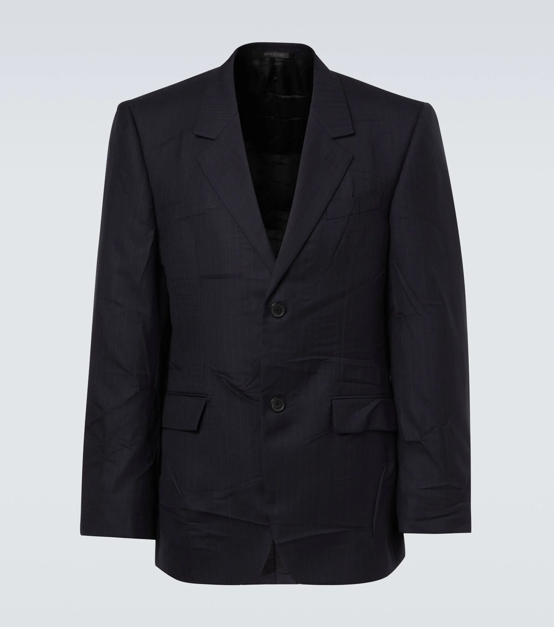 Innovation is at the heart of Balenciaga, which proudly presents its modern interpretation of fashion in every piece. This pinstripe blazer is crafted in Italy from pure wool and tailored to a single-breasted silhouette. Product Details - Material: 100% wool - Care instructions: dry clean - Made in Italy - Designer color name: Dark Navy - Item color: blue - Lining: 100% cupro - Pocket lining: 100% cotton - Contains non-textile parts of animal origin - Closure: buttoned front - Pockets: angled chest pocket, flap pockets, internal pocket - Notched lapel - Cuff: four buttons - Vent: single - Item number: P01098422 Size & Fit - True to size - Shoulder pad inserts - Regular fit - Non-stretchy fabric - Falls below the hip - slit length 22cm-8.5" - Height of model is 189cm-74.5" and wears a size IT 50