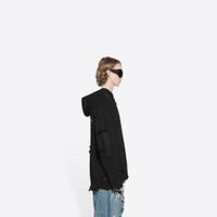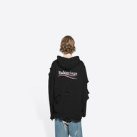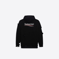Political Campaign Destroyed Hoodie in black knit PRODUCT DETAILS • Cotton knit • Destroyed knit • Large fit • Raw hem bottom • Raw hem cuffs • Dropped shoulder • Hood whithout drawstring • Political Campaign artwork embroidered at chest • Political Campaign artwork printed on back • Made in Italy • Dry cleaning • Model is 185 cm / 6'10'' and is wearing a FR size S Material: 100% cotton