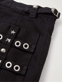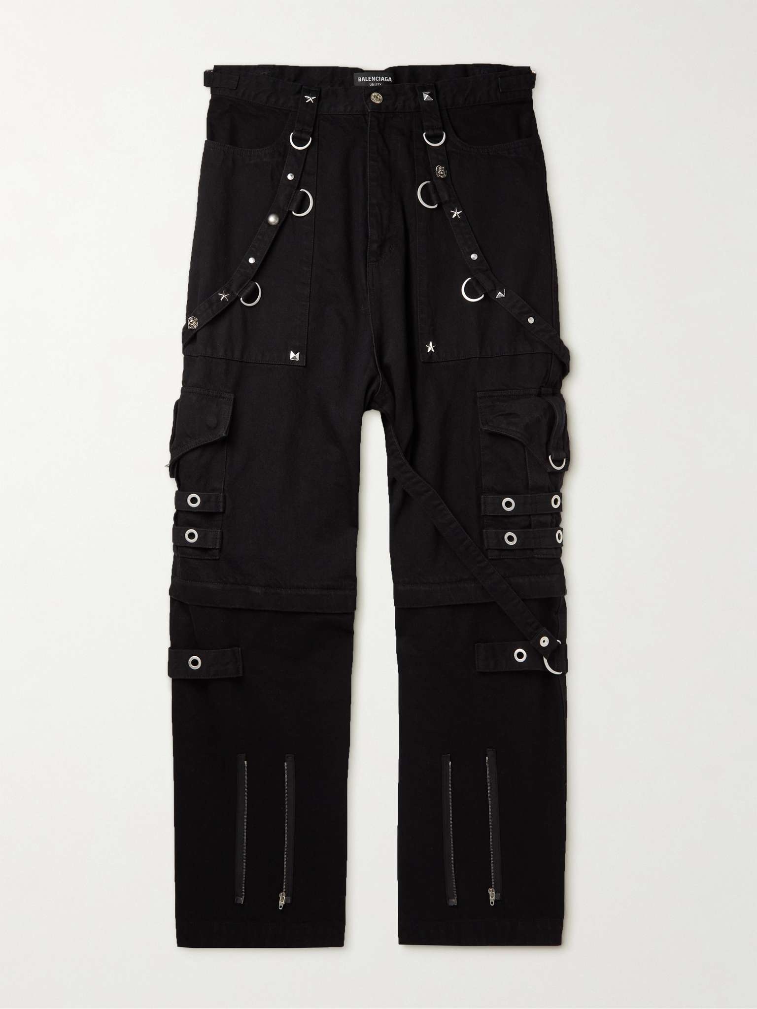 - Black denim - Belt loops, adjustable waist tabs, straps, two front slash pockets, two cargo pockets, two back patch pockets, removable zipped bottoms, studded - Button and zip fastening - 100% cotton - Dry clean - Designer wash: Pitch Black