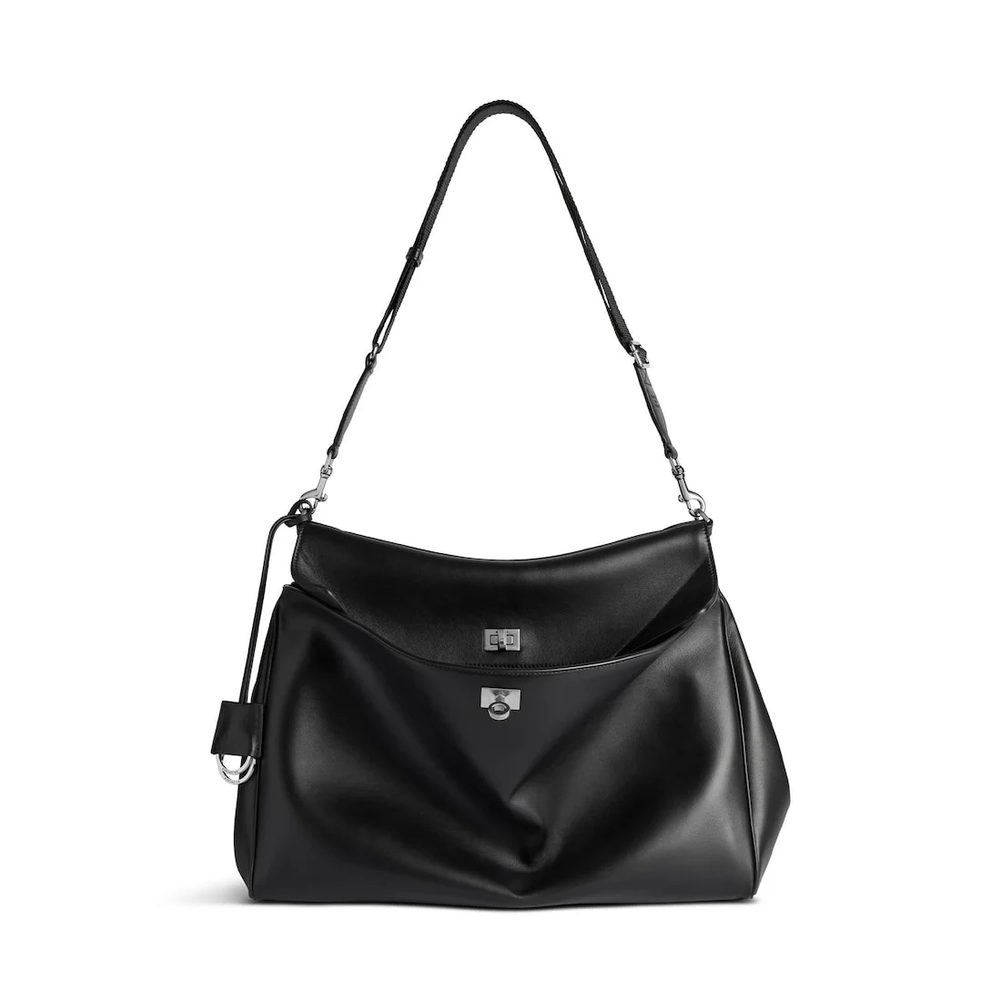 Rodeo Messenger Bag in black smooth calfskin, aged-silver hardware PRODUCT DETAILS • Dimensions: L16 x H12,4 x W6,3 inch • Smooth calfskin • Messenger • Adjustable and removable webbing strap (drop: 22,8 inch) • Crossbody and shoulder carry • Removable cloche cles with two split rings • Aged-silver hardware • Wide front pocket • Turn lock closure • 1 main compartment • 1 inner zipped pocket • 2 flat pockets at back • Side snaps • 4 brass feet • Nappa lambskin lining • Made in Italy Material: calfskin, polyester