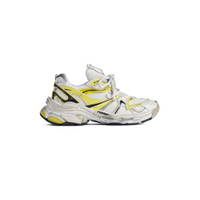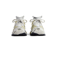 Runner 2.0 Sneaker in white, yellow and black mesh and polyurethane PRODUCT DETAILS • Leather free • Sneaker • Mesh and polyurethane • Worn-out effect • Printed size at the edge of the toe • Debossed size at back • Runner logo printed on exterior • Balenciaga logo debossed on the tongue • Balenciaga logo at the back of the heel • Back pull-on tab • Made in China Upper: polyurethane, polyester - Sole: rubber, TPU, EVA, polyurethane - Insole: foam