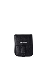 Balenciaga wallet bag in black leather. White logo print on front. Adjustable black shoulder strap. Dimensions: height: 16, length: 13 cm, depth: 2 cm. Made in Italy.