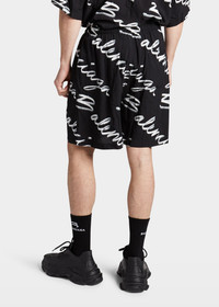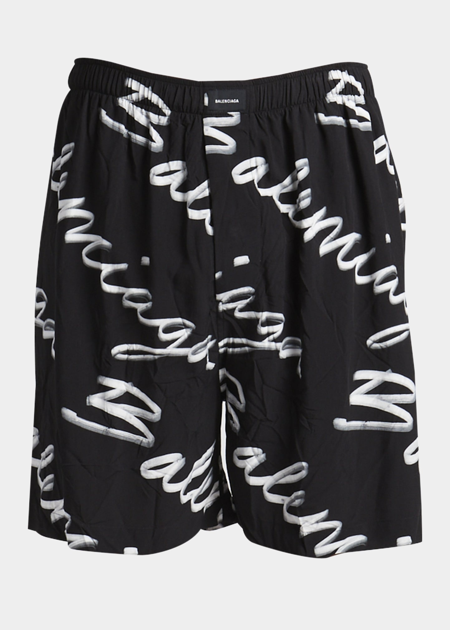 Balenciaga shorts with a scribble logo motif Elasticized waist Flat front Side slip pockets Back patch pocket Relaxed legs Knee length Pull-on style Viscose Made in Italy Model is 6'1"/185cm. Online Inquiries: BGS21_N9L4F| Store Inquiries: #4341991