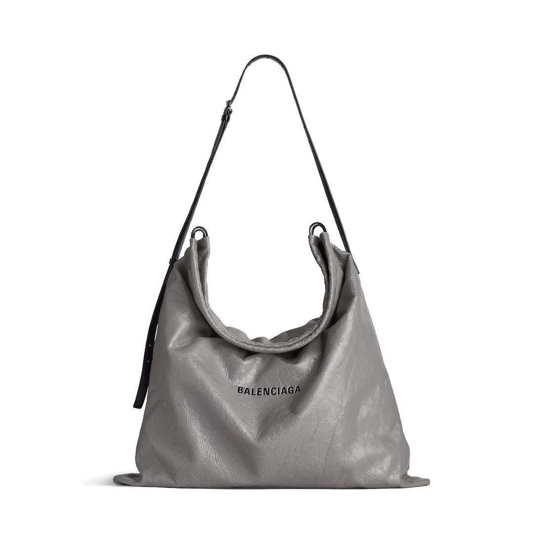 Shopper Large Dust Bag Crossbody Pouch in Balenciaga grey Arena lambskin, aged-silver hardware PRODUCT DETAILS • Dimensions: L18,5 x H18,1 x W0,4 inch • Arena lambskin • Dust bag shape • Adjustable crossbody strap (drop: 11 inch) • Crossbody and shoulder carry • Balenciaga logo debossed at front • Aged-silver hardware • Drawstring and zipped closure • 1 main compartment • 1 inner zipped closure • Nylon lining • Made in Italy Material: lambskin