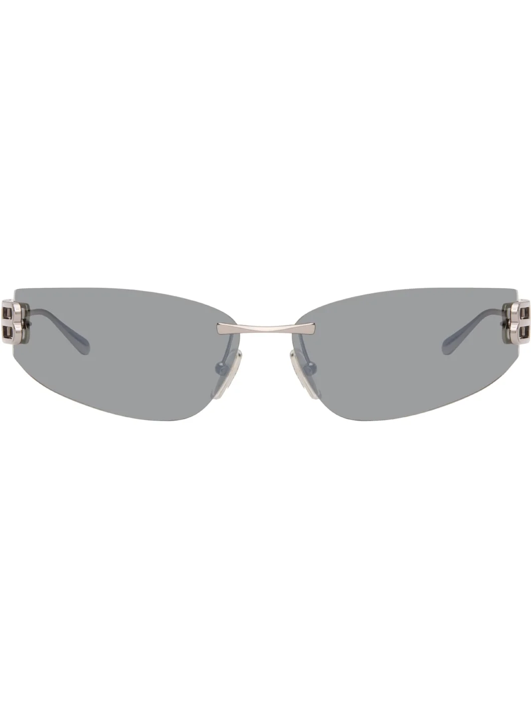 Rectangular metal-frame sunglasses. · Gray lenses · 100% UVA/UVB protection, category 3 · Adjustable rubber nose pads · Logo hardware at temples · Includes case · Size: 76.15 120 Supplier color: Silver Metal. Made in Japan 261342M134030