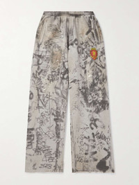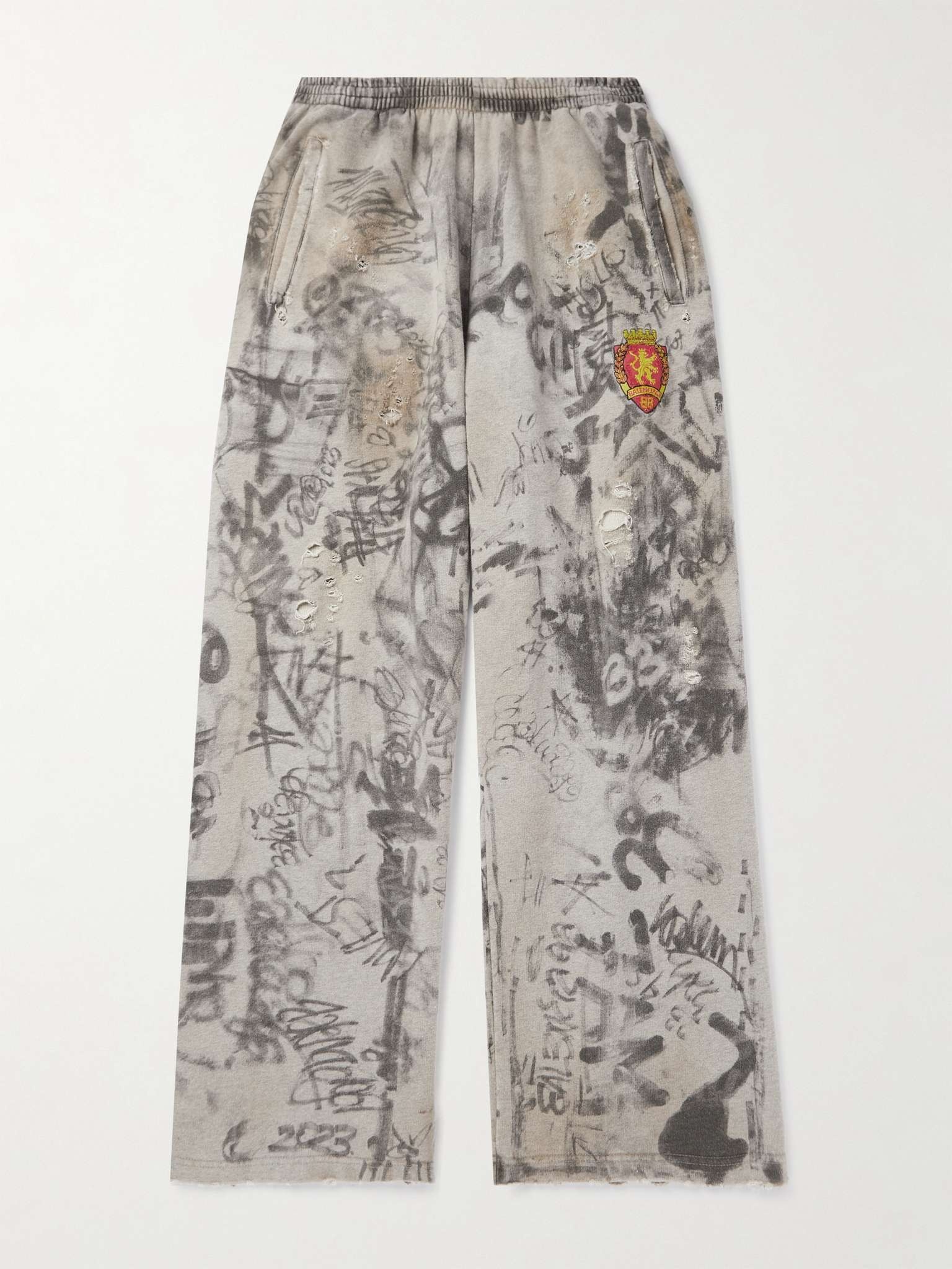 The nonchalant dress codes of artistic graffers and street skaters serve as inspiration for Balenciaga's sweatpants. They're cut for a wide-leg fit from soft fleece-back cotton-jersey that's gently distressed and printed with graffiti-inspired artwork. Style yours with the matching hoodie and the house's footwear. Size & Fit - Fits true to size. Take your normal size - Wide leg, low-crotch style - Adjustable at the waist - Mid-weight, slightly stretchy fabric - Model is shown wearing a S - Model measures: waist size 30, height 6'2"/ 188cm Details & Care - Tonal-grey and brown fleece-back cotton-jersey - 100% cotton - Machine wash