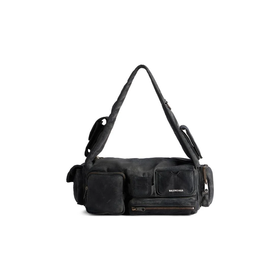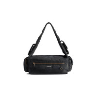 Superbusy Small Sling Bag in black distressed recycled nylon, aged-gold hardware PRODUCT DETAILS • Dimensions: L14,5 x H5,1 x W4,7 inch • Distressed nylon • Sling bag • Shoulder strap with 1 hook Balenciaga engraved (drop: 11 inch) • Balenciaga logo embossed at front • Aged-gold hardware • Double end zipped closure • 1 main compartment • 2 pockets on strap • 2 zipped pockets at front • 1 EarPods case to fit AirPods Pro at front • 1 card holder at front • 1 flap pocket and 1 zip pocket on sides • 1 zipped pocket at back • 1 back hook • BB logo engraved on zipper puller • Cotton canvas lining • Made in Italy polyamide