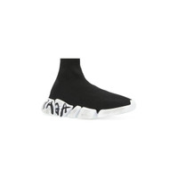 Speed 2.0 Graffiti Sneaker in black recycled knit and white sole unit PRODUCT DETAILS • Technical 3D knit • Ultra-articulated molded sole unit • "No Memory” sole technology monocolor sole unit • Extra light: nearly barefoot feel • Balenciaga graffiti logo in color contrast on sole • Embossed logo on the back of sole • Worn-out effect on sole • Made in Italy • Do not machine wash and wipe with a soft cloth Material: 92% polyester, 8% elastane