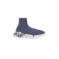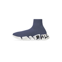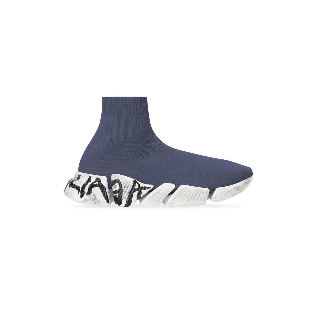 Speed 2.0 Graffiti Sneaker in dark grey recycled knit and white sole unit PRODUCT DETAILS • Technical 3D knit • Ultra-articulated molded sole unit • "No Memory” sole technology monocolor sole unit • Extra light: nearly barefoot feel • Balenciaga graffiti logo in color contrast on sole • Embossed logo on the back of sole • Worn-out effect on sole • Made in Italy • Do not machine wash and wipe with a soft cloth Material: 92% polyester, 8% elastane