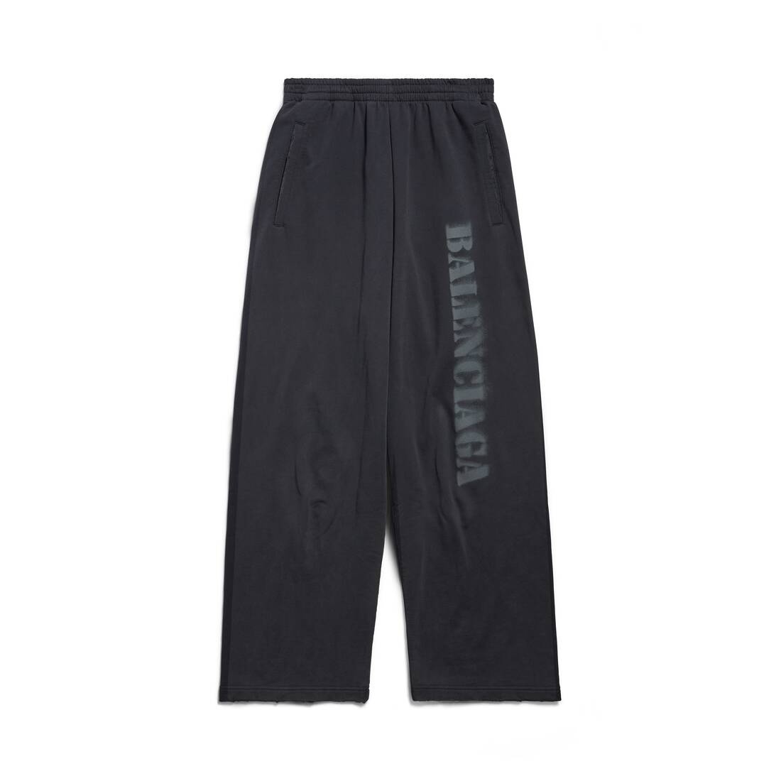 Stencil Type Baggy Sweatpants in black and dark grey archetype fleece PRODUCT DETAILS • Archetype fleece • This item is unisex • Large fit • Mid-waist • Elasticated waistband • 2 slash pockets • Stencil type logo printed on left leg • Worn-out and washed-out effect • Made in Portugal • Cold machine wash • Model is 185 cm / 6'1" and is wearing a size S Material: 100% cotton