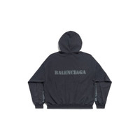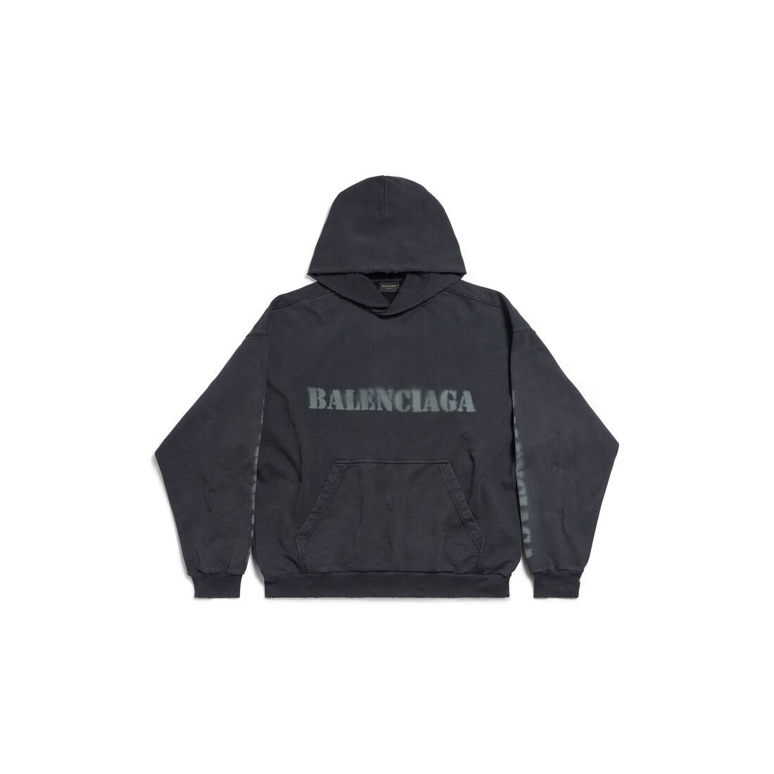 Stencil Type Hoodie Medium Fit in black and dark grey archetype fleece PRODUCT DETAILS • Archetype fleece • This item is unisex • Medium fit • Hood without drawstring • Dropped shoulders • 1 kangaroo pocket on front • Gathered at cuffs and waistline • Stencil type logo printed at front, back and sleeves • Worn-out and washed-out effect • Made in Portugal • Cold machine wash • Model is 185 cm / 6'1" and is wearing a size S Material: 100% cotton