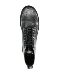 Strike leather ankle boots from BALENCIAGA featuring black/white, leather, spray-paint effect, embossed logo to the front, pull-tab at the heel, round toe, front lace-up fastening, branded footbed and chunky rubber sole. We've partnered with Good On You — an independent agency that rates how brands perform in relation to their impact on the planet, people and animals, with a multi-criteria rating simplified to a five points scale. In order to be awarded our conscious label, larger brands need to score a minimum of four out of five ('Good'), while smaller brands must score at least three out of five ('It's a start'). This item comes from a brand rated four out of five ('Good') by Good on You. Please note, this is a brand-level rating and does not guarantee that this product is made with conscious materials.. DETAILS - Heel: 6.5 cm; - Height: 14 cm; - Sole height: 4.5 cm; - Outer: 100% calf leather, Lining: 100% calf leather, Sole: 100% rubber - Made in Italy