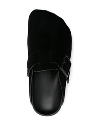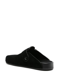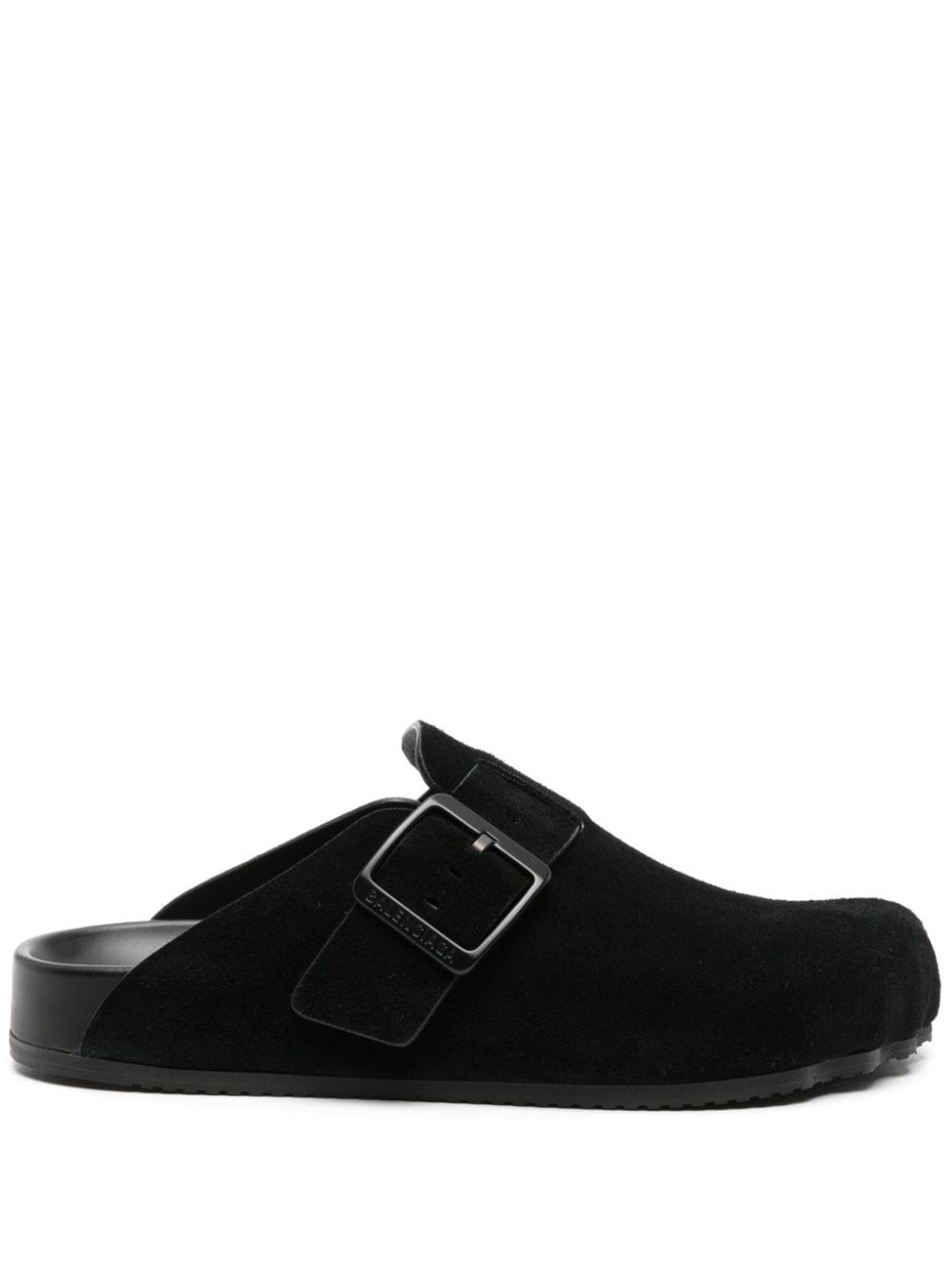 Sunday suede mules Highlights - Black - Calf suede - Decorative buckle detail - Logo-buckle fastening - Slip-on style - Asymmetric toe - Moulded footbed - Branded insole - Flat rubber sole - We've partnered with good on you â an independent agency that rates how brands perform in relation to their impact on the planet, people and animals, with a multi-criteria rating simplified to a five points scale. in order to be awarded our conscious label, larger brands need to score a minimum of four out of five ('good'), while smaller brands must score at least three out of five ('it's a start'). - This item comes from a brand rated four out of five ('good') by good on you at the time it was added on farfetch. please note, this is a brand-level rating and does not guarantee that this product is made with conscious materials. - Learn more about what makes a product conscious on our conscious criteria page Made in Italy Composition Outer: Calf Leather 100% Sole: Rubber 100% Lining: Calf Leather 100% SIZE & FIT Measurement HEEL 0.98 in(2.5 cm) Sole height 0.59 in(1.5 cm)