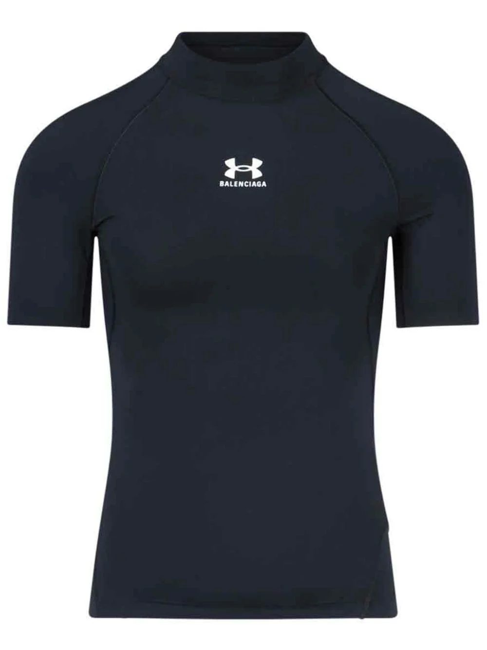 x Under Armour® mock neck T-shirt Highlights - Black - Logo print to the front - Short raglan sleeves Made in Italy Composition Polyester 85%, Elastane 15% SIZE & FIT FittingInformation Designed for a close fit throughout Made from a lightweight stretch fabric, this piece offers elasticity and flexibility when worn