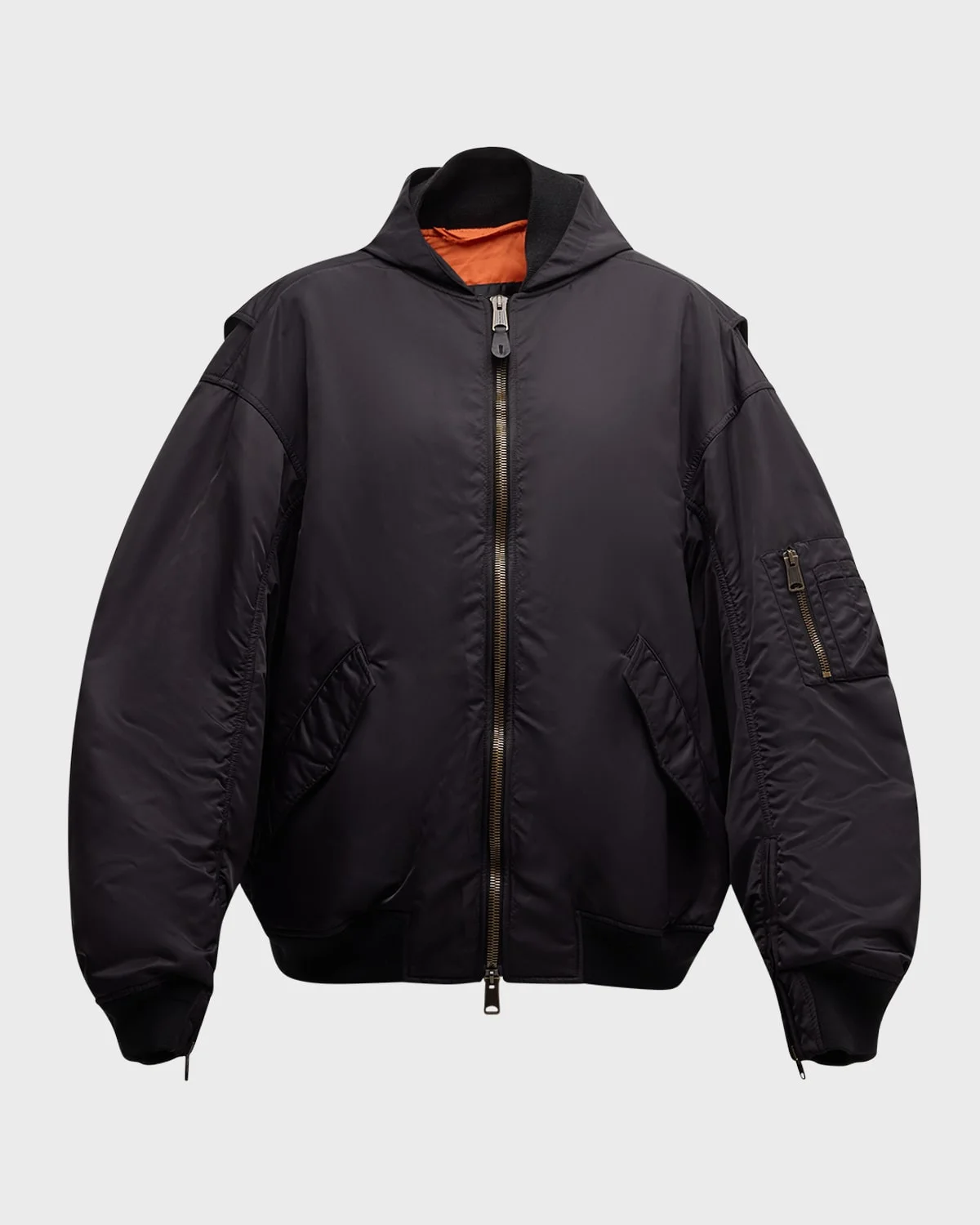 Balenciaga bomber jacket in vegetable dyed technical fabric Paneled construction Inset hood Double-ended zip fastening Leather tab zipper puller Cargo pocket on left sleeve Two snap flap pockets at front Zipped cuffs Ribbed trims Contrasting lining Tape logo at back Nylon/polyamide Made in Italy Model is 6'1"/185cm.