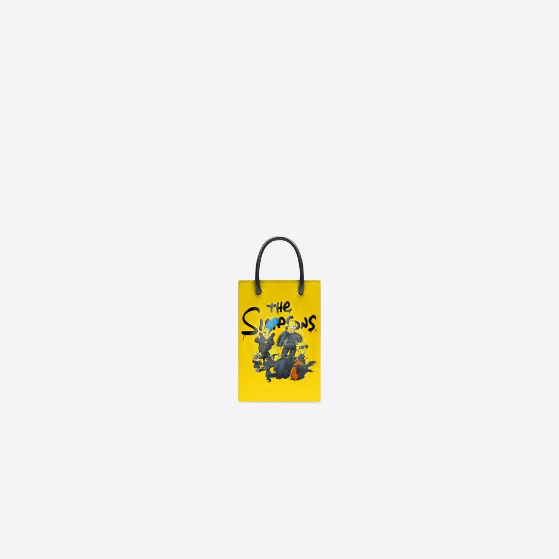 Shopping Phone Holder in yellow shiny box calfskin and semi-shiny palladium hardware with an artwork reference to The Simpsons TM & © 20th Television family dressed in recognizable Balenciaga pieces from past seasons. PRODUCT DETAILS • Dimensions : L7 x H4,8 x W1,7 inch • Shiny box calfskin • Phone holder • Adjustable crossbody strap (21,2 inch) • Two lambskin thin round handles • The Simpsons artwork printed at front TM & © 20th Television • Semi-shiny palladium hardware • Snap magnet closure • Canvas lining • Made in Italy • Wipe with a soft cloth Material: 100% calfskin