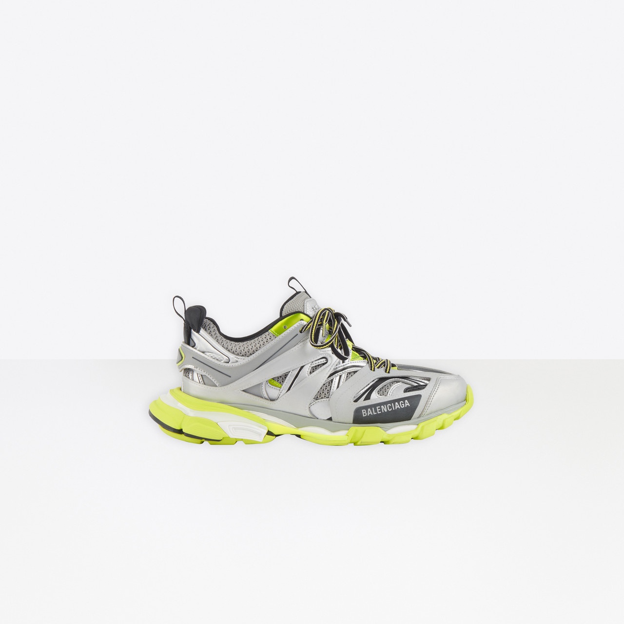 Track sneaker in silver and neon yellow nylon and mesh PRODUCT DETAILS Composition: 50% Polyester, 50% Nylon - 100% non leather sneaker - Written size at the edge of the toe - Track embossed at the back of the heel - BB embossed on front of the outsole - Logo printed on the exterior - Logo embossed on the tongue - Double laces knotted in a usual equipment way - Back pull-on tab and tongue pull-on tab - Dynamic sole design with an augmented back to propel feet forward - Washed effect for a well-worn look - Made in China - Wipe with a clean and soft cloth - The item comes with a Balenciaga dustbag and box