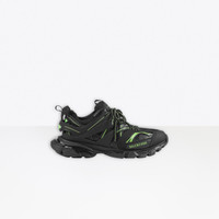 Track Sneaker in black and neon green mesh and nylon PRODUCT DETAILS Composition: 60% Polyurethane, 28% Polyester, 12% Nylon - 100% non leather sneaker - Written size at the edge of the toe - Track embossed at the back of the heel - BB embossed on front of the outsole - Balenciaga printed on the exterior - Balenciaga embossed on the tongue - Double laces knotted in a usual equipment way - Back pull-on tab and tongue pull-on tab - Dynamic sole design with an augmented back to propels feet forward - 1 additional pair of laces included - Made in China - Wipe with a soft cloth - The item comes with a Balenciaga dustbag and box