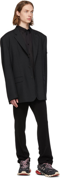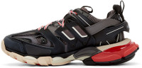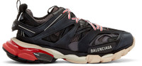 Low-top mesh, faux-leather, and rubber sneakers in black and grey. 3M reflective trim throughout. Logo embossed and sizing embroidered in white at round toe. Lace-up closure in white, black, and red. Webbing pull-loop and embossed logo at padded tongue and heel. Logo printed in white at outer side. Foam rubber midsole in black, beige, and red. Beige, black, and red treaded rubber outsole. Tonal stitching.