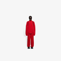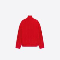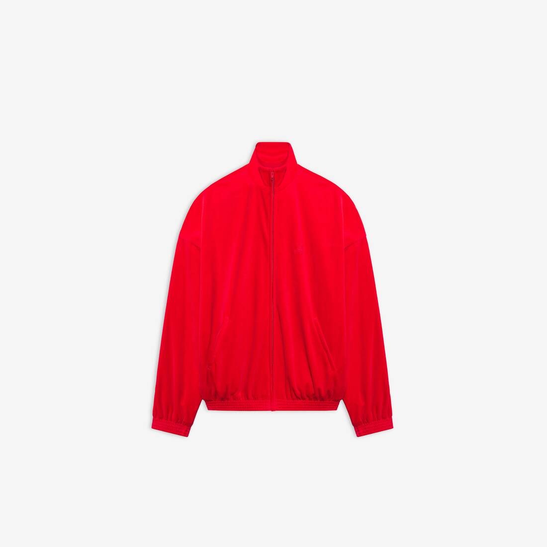 Tracksuit Jacket in red stretch cotton velvet PRODUCT DETAILS • Organic stretch cotton velvet • Oversize fit • Dropped shoulder • High neck • Zipped front • 2 slash pockets at front • Balenciaga Hotels and resorts embroidery at chest and back • Elasticated waistline and cuffs • Made in Italy • Dry cleaning • Model is 177 cm / 5'80" and is wearing a FR size S Material: 100% cotton