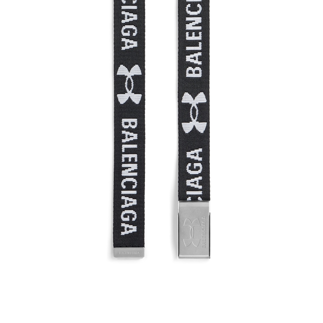 Under Armour® Skater Belt in black and white jacquard webbing, aged-silver hardware PRODUCT DETAILS • Dimensions: Width: 1,2 inch • Jacquard webbing • Metal flip closure buckle with Under Armour® artwork engraved • Under Armour® artwork on webbing in contrasted color • In collaboration with Under Armour® • Metal tip with Balenciaga logo engraved • Aged-silver hardware • Made in Italy Material: polyamide