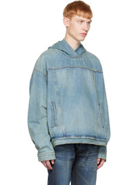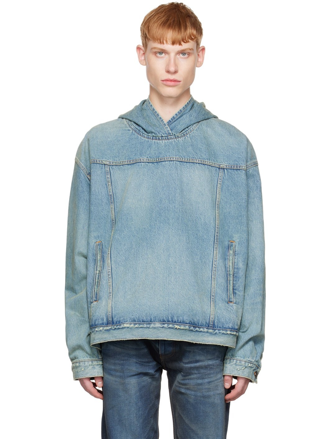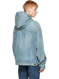 Non-stretch cotton denim jacket. Distressing and fading throughout. · Kangaroo pocket · Adjustable button-tab hem · Single-button barrel cuffs · Logo-engraved bronze-tone hardware · Contrast stitching in tan Supplier color: True blue 100% cotton.