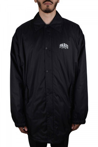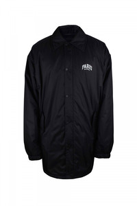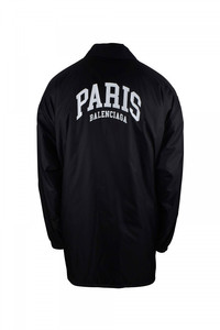 Black Balenciaga waterproof jacket. White "Balenciaga Paris" logo on chest. White logo on back. Snap button closure. Lapel collar. Long sleeves. Elasticated cuffs and hem. Side pockets with snap closure. Polyester and viscose. Made in Italy.