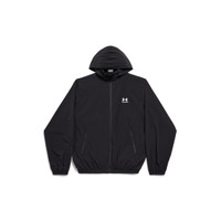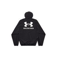 Under Armour® Winbreaker in black stretch nylon is from look 17 of Balenciaga Spring 25 Collection. PRODUCT DETAILS • Stretch nylon • Attached hood • Zipped closure • 2 zipped slash pockets at front • Elasticated cuffs with drawstrings • Drawstring hem • Under Armour® artwork printed at front and back • In collaboration with Under Armour® • Made in Italy Main material: 85% polyamide, 15% elastane