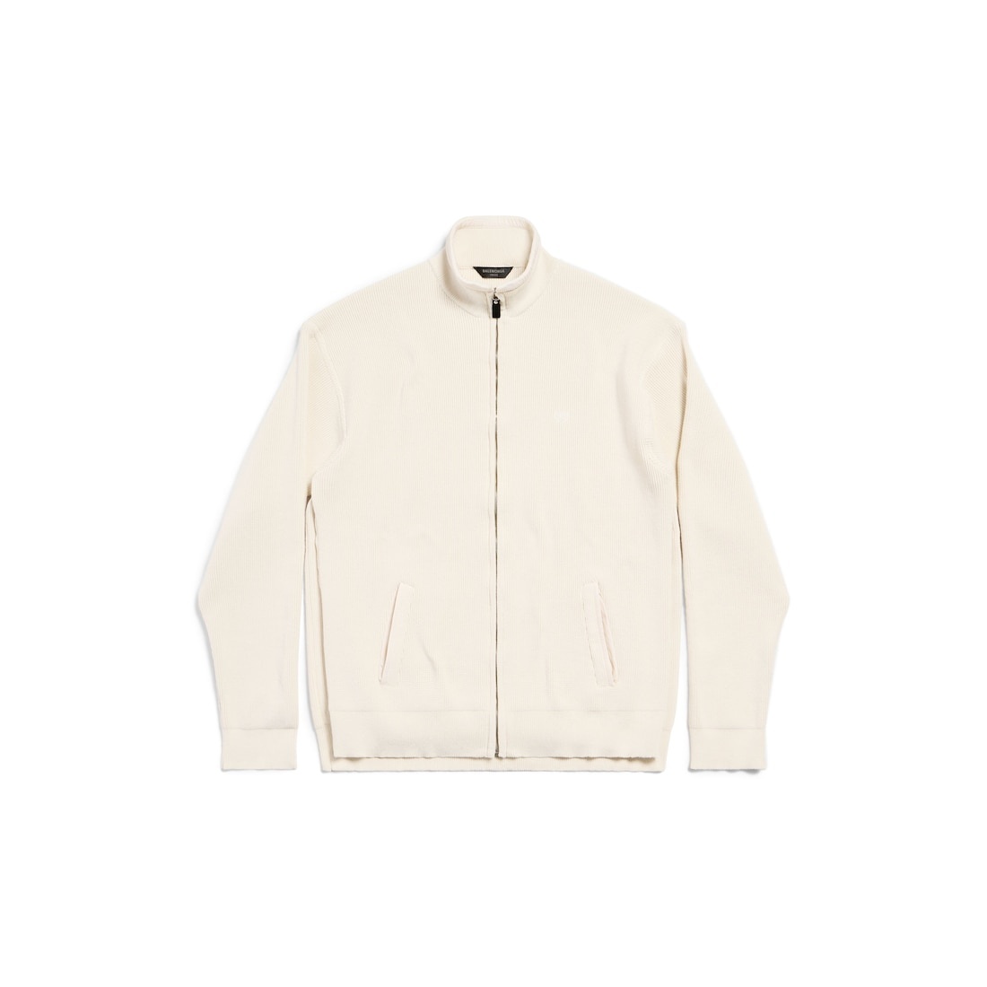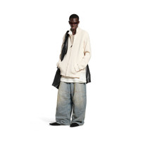 Intertwined Zip-Up Sweater in beige cotton mix knit is from look 21 of Balenciaga Spring 25 collection. PRODUCT DETAILS • Cotton mix knit • Trompe l'œil, double front • Longer front • Dropped shoulders • Long sleeves • Zipped front • Embroidered Laurel Classic at chest • BB Garderobe artwork at back • 2 slash pockets • Made in Italy Main material: 53% polyester, 47% cotton
