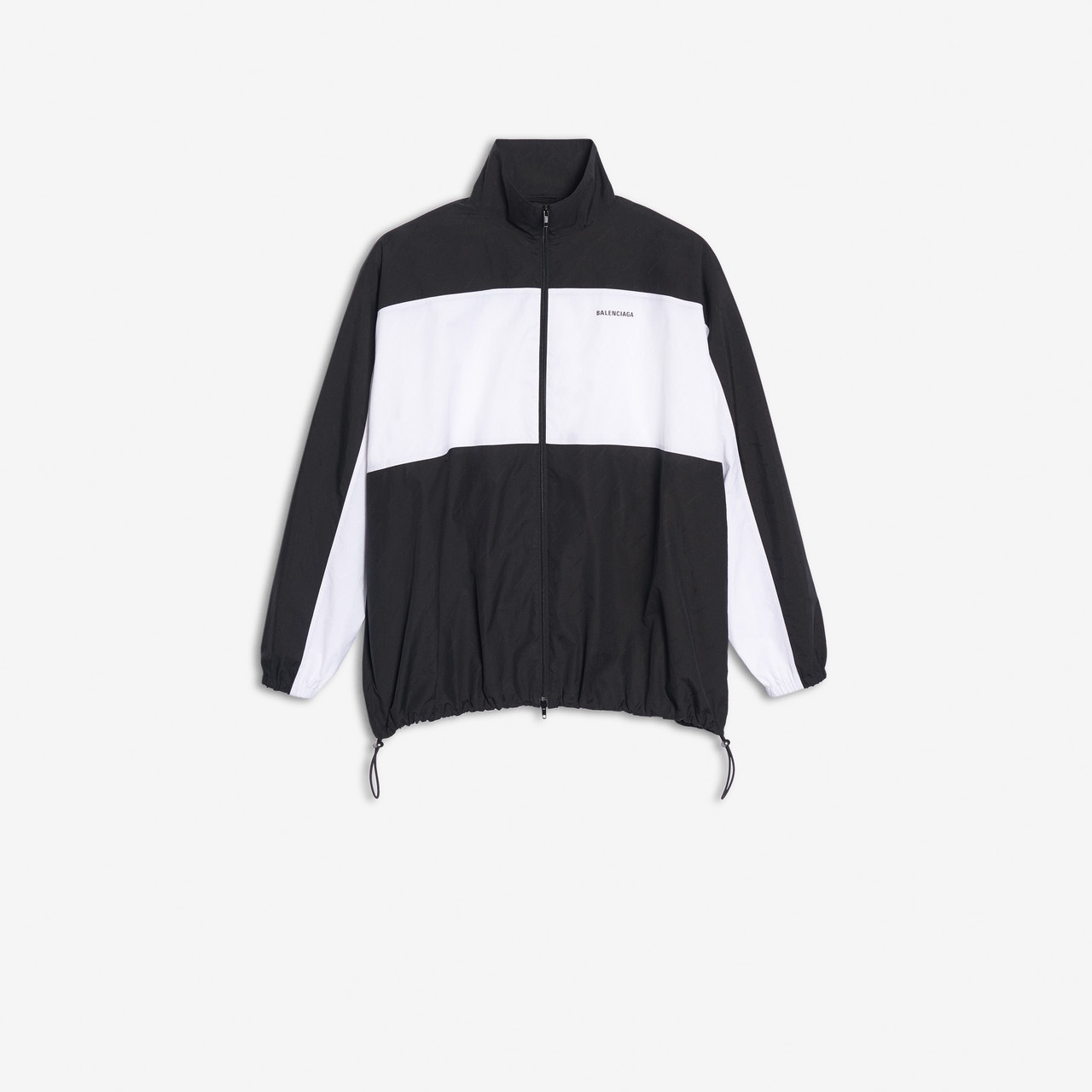 Zip-Up Jacket in black and white jacquard poplin PRODUCT DETAILS Composition: 100% Cotton - Semi-shiny cotton jacquard poplin with contrasting white cotton panel - High neck - Slightly oversized fit - Zipped front - Drawstring at the waistband - Balenciaga logo embroidered on chest - Made in Italy - Hand wash - Model is 185 cm / 72,8 inches and is wearing a size 46