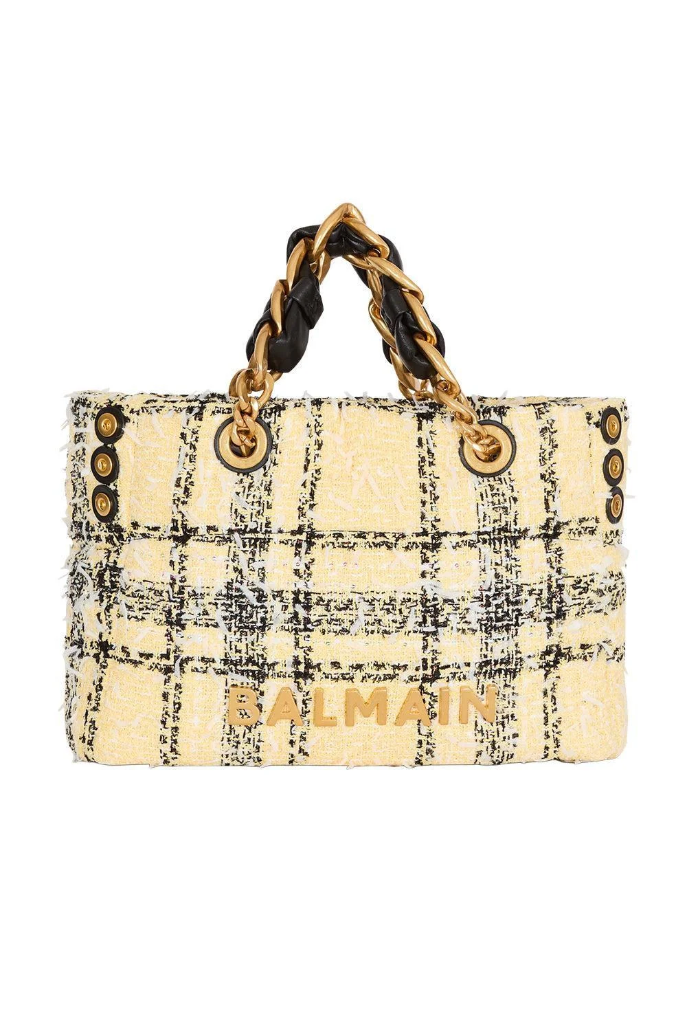 DETAILS AND INSIGHT Balmain 1945 soft cabas tote in multicolore. 50% Polyester 25% Polyamide 25% Cotton; Lining: 100% Cotton 28Lx21Hx10P Made In Italy Style GN1FD871TTWN-AAA