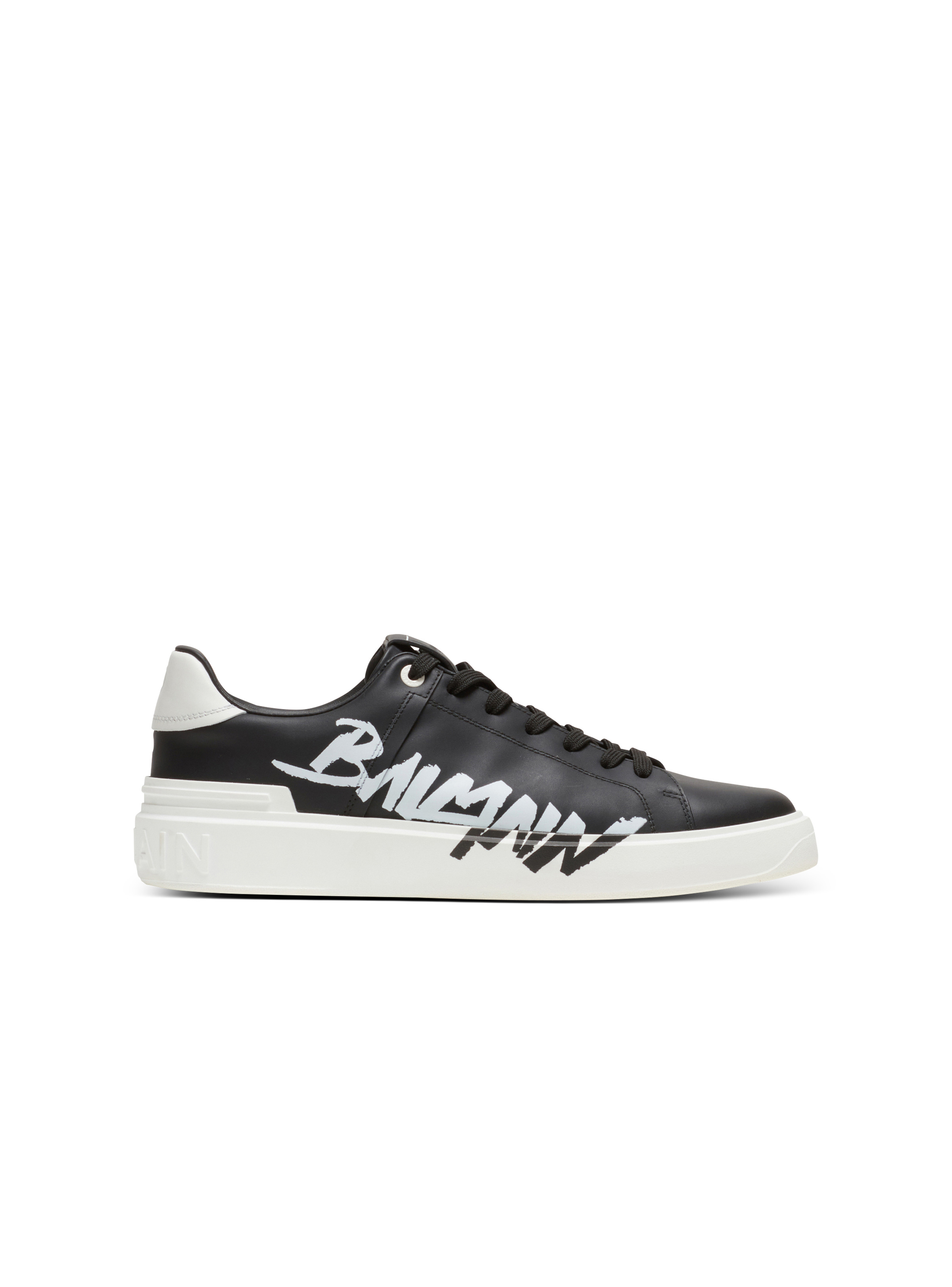 B-Court printed smooth calfskin sneakers - Contrasting, XL Balmain signature printed on the side down to the sole - Double lace fastening - Embossed leather Balmain Paris logo on the tongue - Thick rubber outsole, debossed Balmain logo - Smooth leather insole - Tone-on-tone leather lining - Sole height: 3.5 cm - Main material: calfskin - Made in Italy - Item: BM1VI288LBAL